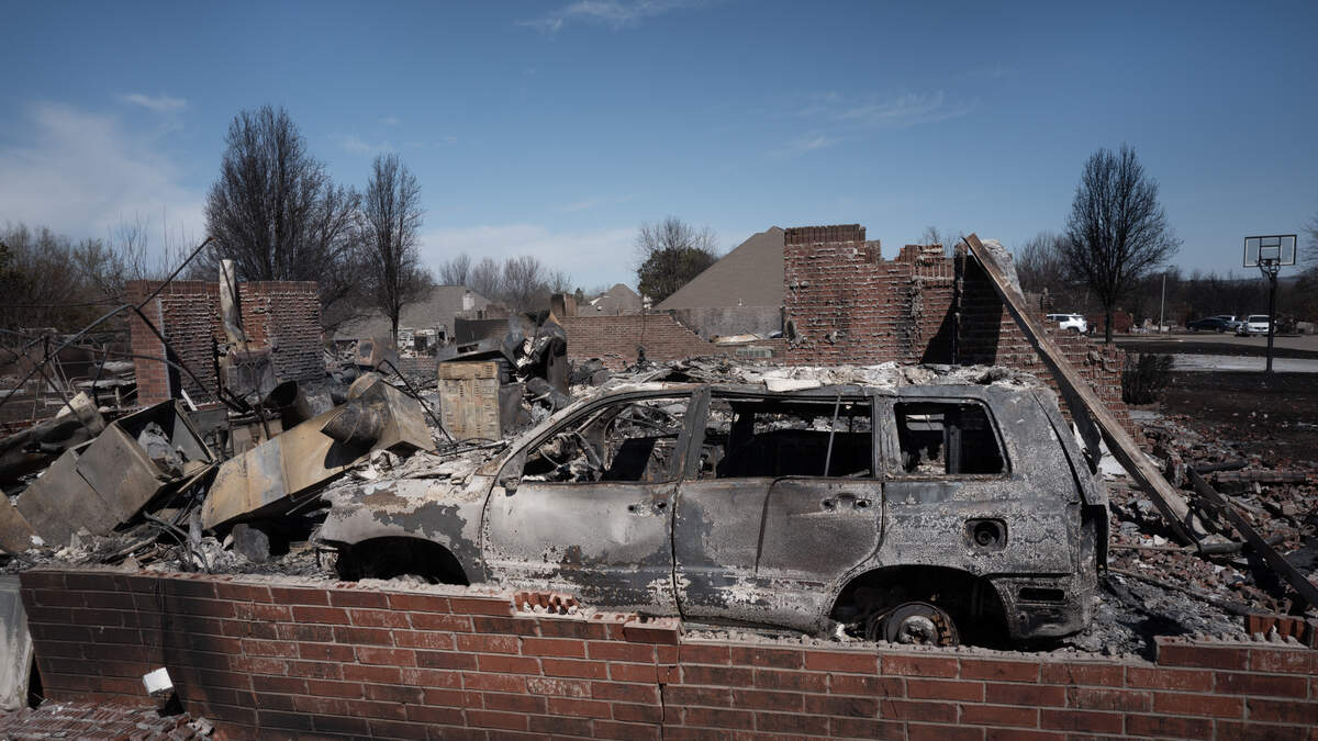 A burned out vehicle sits in the garage of a home that was destroyed during Friday's wildfires on March 16, 2025 in Stillwater, Oklahoma.Photo: Getty Images