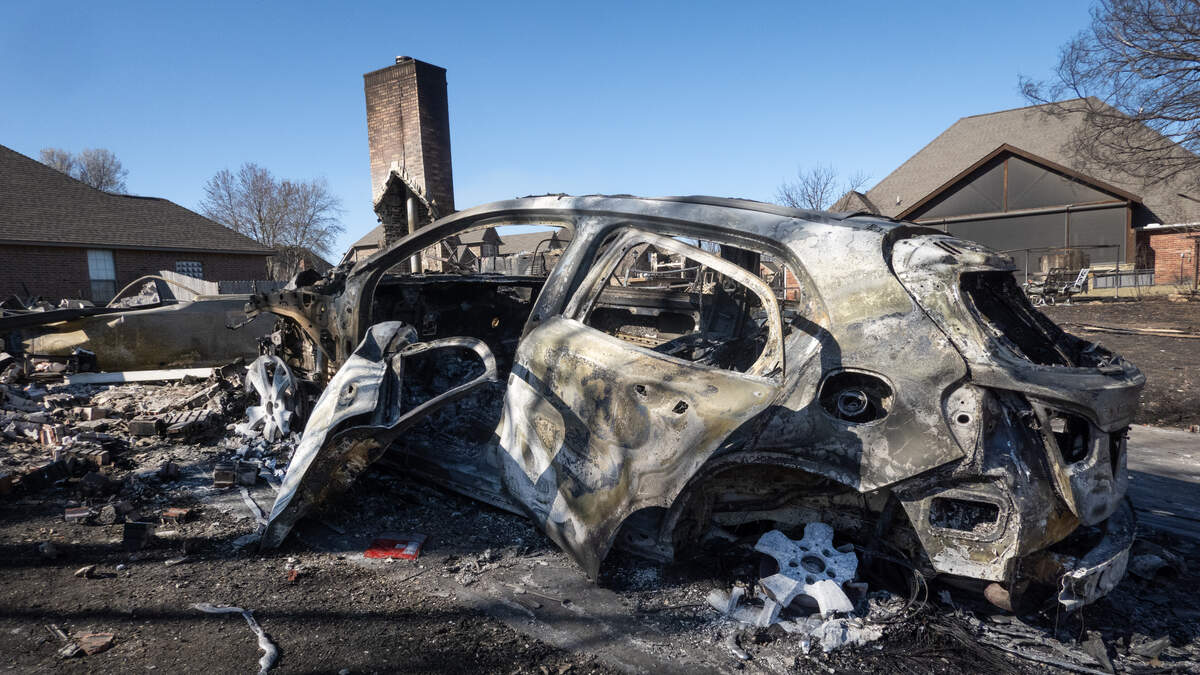 A vehicle sits in the driveway of a home that was destroyed during wildfires on March 16, 2025 in Stillwater, Oklahoma. Photo: Getty Images